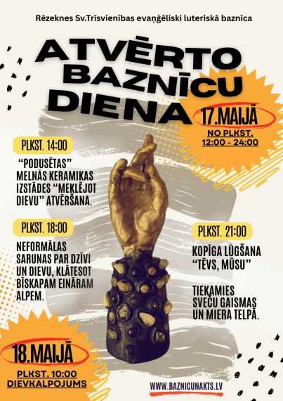 Atvērto baznīcu dienas ietvaros 2025.gada 17.maijā Rēzeknes Sv. Trīsvienības evaņģēliski luteriskā baznīca būs atvērta no plkst.12:00 līdz plkst.24:00.