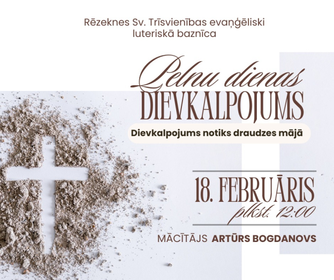 Pelnu trešdienas- Gavēņa laika sākuma dievkalpojums, trešdien, 𝟏8. 𝐟𝐞𝐛𝐫𝐮ā𝐫ī 𝐩𝐥𝐤𝐬𝐭. 𝟏𝟐.𝟎𝟎.